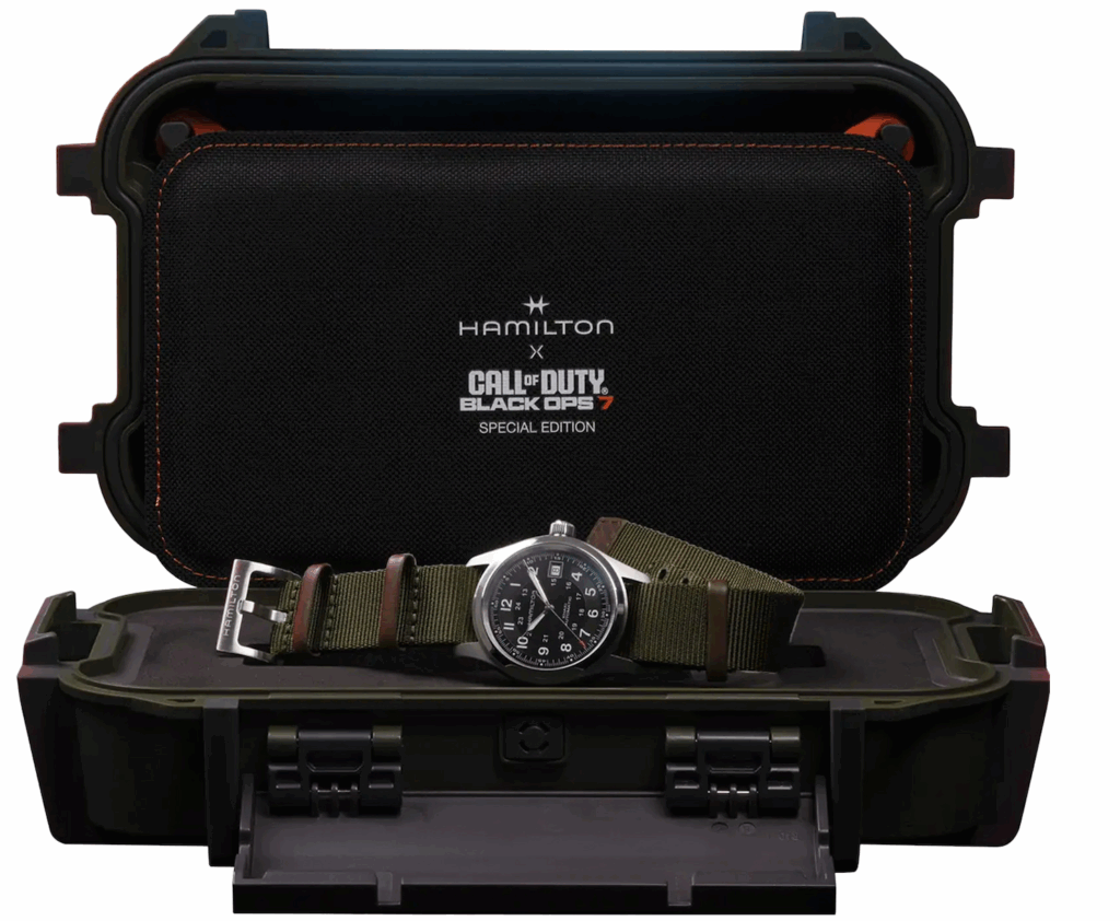 - The watch is a customized Khaki Field Auto model with a 38mm stainless steel case. It features a durable khaki green NATO strap and a custom-engraved caseback with the Black Ops icon. Compared to other gaming-inspired watches, the Hamilton Call Of Duty collaboration stands out for its authentic military design, use of high-quality materials like stainless steel and a khaki green NATO strap, and subtle references to Call Of Duty in the engraving, rather than bold graphics or logos seen on other themed timepieces. This approach creates a more refined and wearable accessory that appeals to both watch enthusiasts and gaming fans.