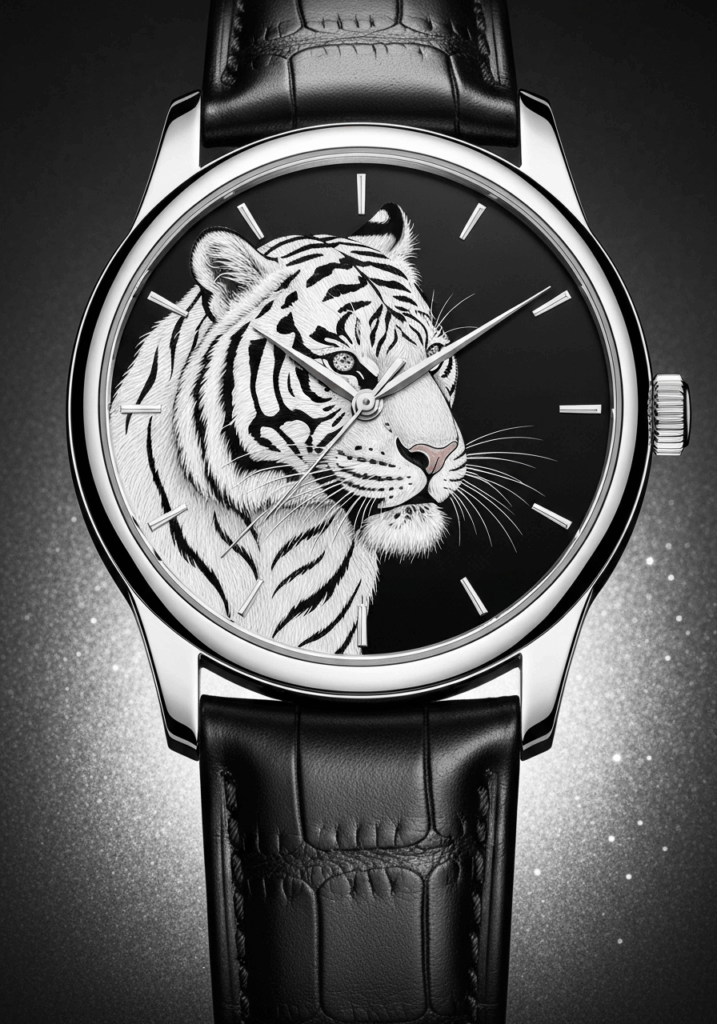 - The dial showcases a stunning micro-painting of a majestic white tiger, symbolizing greatness.