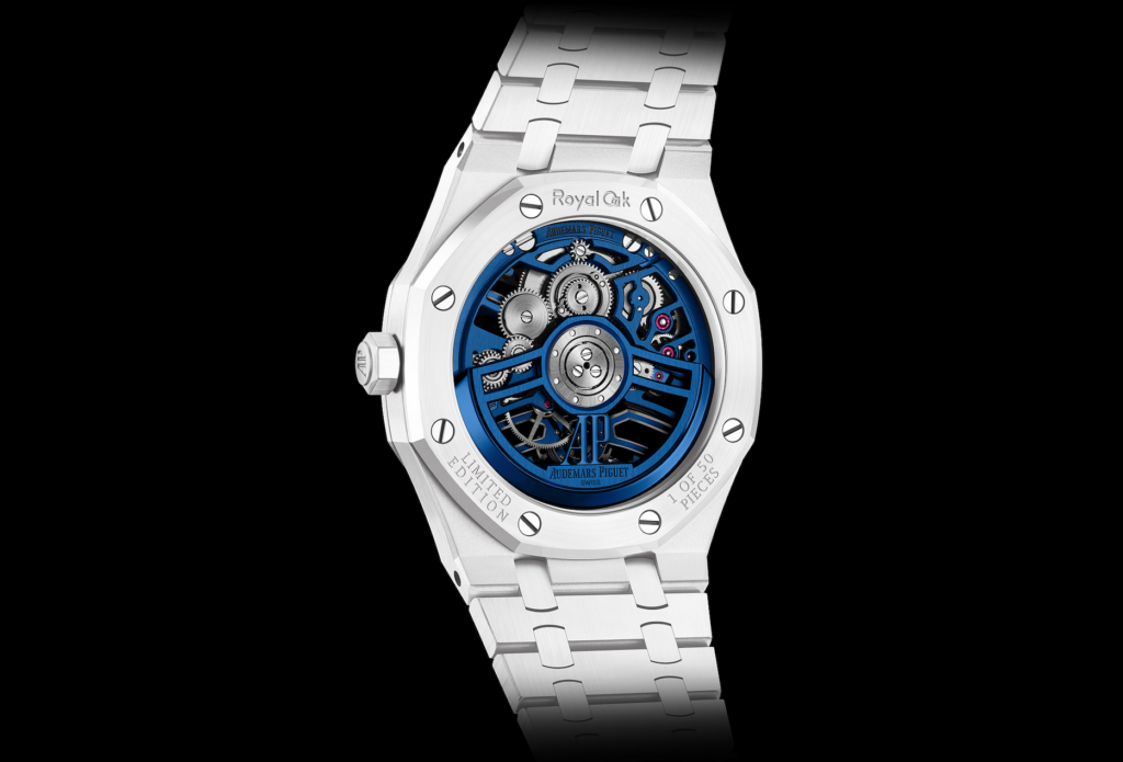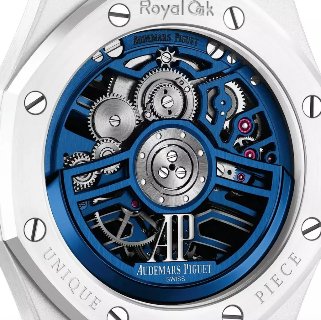 What makes the openworked design of this Royal Oak truly unique is its complete transparency, which exposes the specially developed Calibre 2972. Unlike other models, the skeletonized bridges and mainplate are finished in a striking blue tone, creating a vivid contrast that draws your eye directly to the watch’s heart. This isn’t just about removing the dial; it’s about re-engineering the movement to be a work of art.