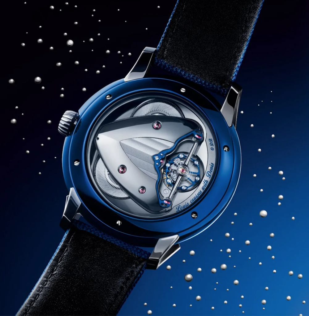 - The luxury watch features a unique Louis Vuitton Tambour case crafted from De Bethune’s signature blued titanium.