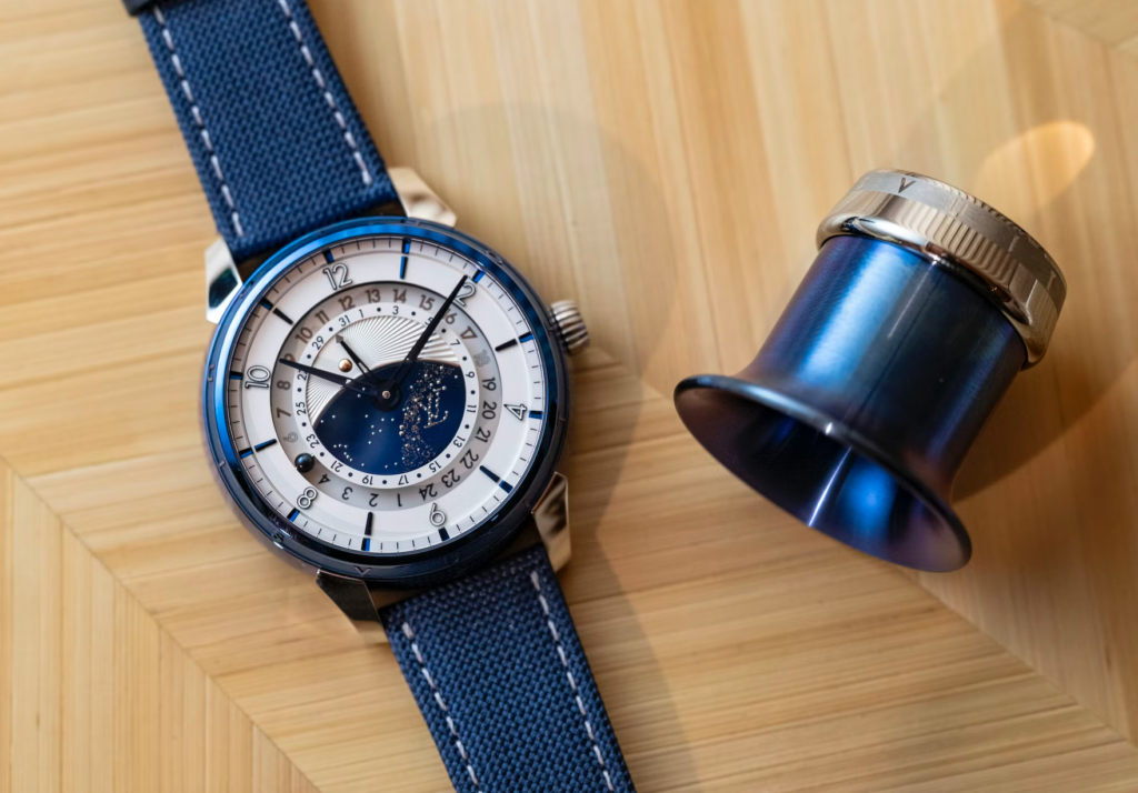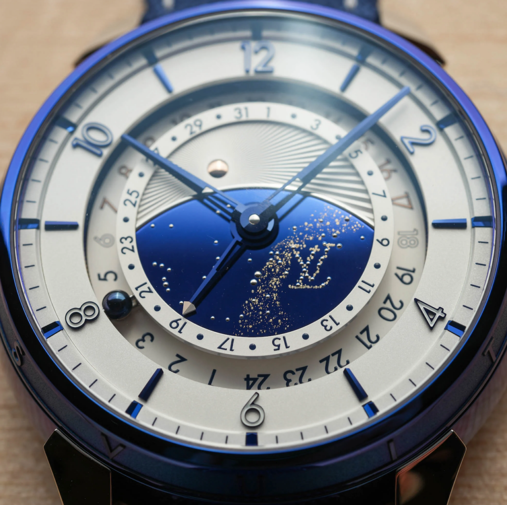 The design of the LVDB-03 is a masterclass in fusion. You can see the distinct DNA of both Louis Vuitton and De Bethune in every detail. The iconic Louis Vuitton Tambour case shape is reimagined using De Bethune’s signature blued titanium, creating a deep, vibrant color that is instantly recognizable to any watch enthusiast.